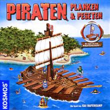 A large, 3D, well-designed cardboard Hispaniola has the pirates fighting over the treasure chests. As pirates are made to walk the many planks, the 4th pirate on the plank will push the 1st pirate into the water. Players have twelve action points to spend moving their pirates around and successful pirates draw a treasure from a bag. The scoring mechanism has a long plank and spring clip for each player, to show your score.